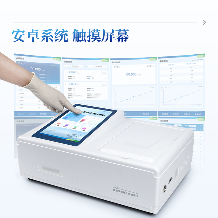 水质四氮检测仪是参考相关标准研发设计制造,本仪器主要检测水质氨氮、硝酸盐氮、亚硝酸盐氮、总氮浓度指标,兼具智能数据分析功能,图表、列表显示数据,分析一目了然;高清晰度彩色液晶触摸显示屏,Android智能操作系统,中文显示界面,中英文键盘,人性化操作,使用更简单。